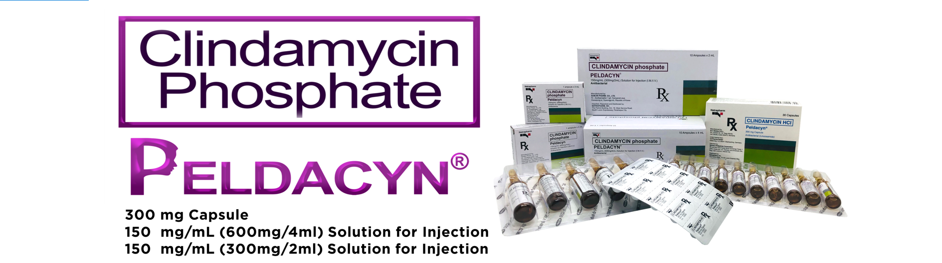 P/P: Cap 300 mg x 30's. Soln for inj 150 mg/mL x 2 mL x 1's, 10's; 4 mL x 1's , 10's.